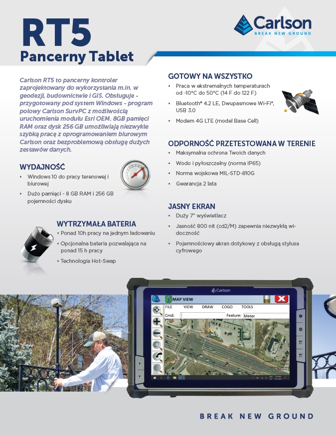 Tablet Carlson RT5 to nie tylko doskonały kontroler polowy, ale także platforma dla precyzyjnego systemu RTK do zastosowań w GIS i geodezji. Obsługuje program polowy Carlson SurvPC, przygotowany dla systemu Windows 10. Tablet wyróżnia 8 GB pamięci RAM oraz dysk o pojemności 256 GB.