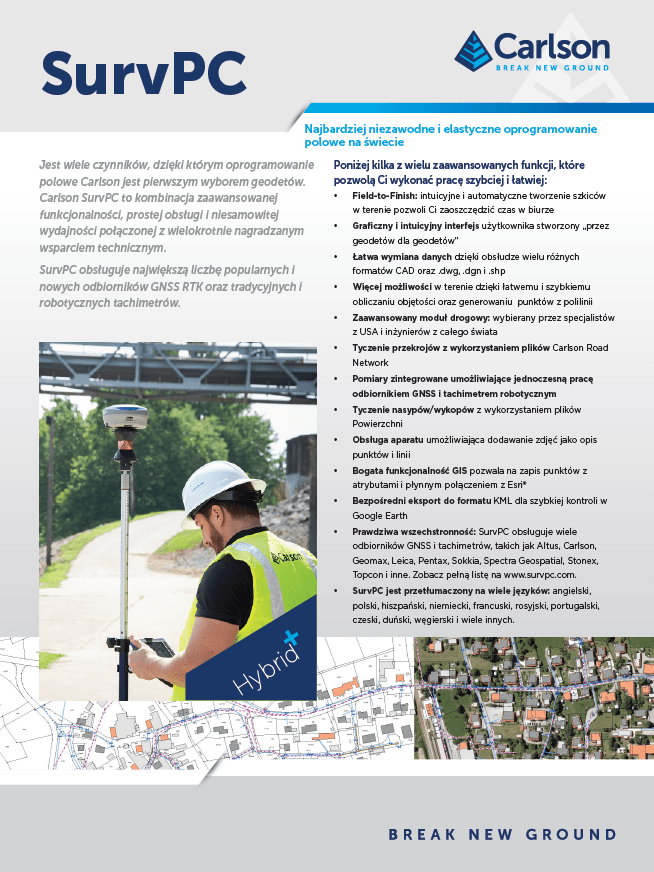 Carlson SurvPC to oprogramowanie pomiarowe na systemy Windows. Służy do obsługi odbiorników GNSS oraz tachimetrów wielu różnych producentów.