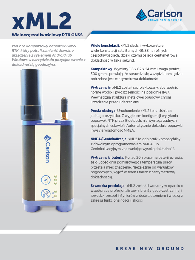 Carlson xML2 to kompaktowy, wieloczęstotliwościowy odbiornik GNSS RTK, który potrafi zamienić dowolne urządzenie z systemem Android lub Windows w narzędzie do pozycjonowania z dokładnością GIS-ową. Odbiornik z powodzeniem można połączyć z oprogramowaniem pomiarowym na system Android, Carlson Layout, a także z programami innych firm.