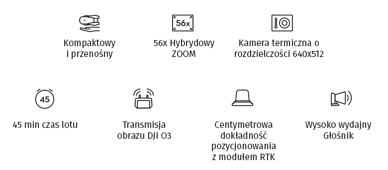Moduł RTK – dzięki modułowi RTK dron termowizyjny jest kompatybilny z ogólnopolską, państwową siecią stacji referencyjnych GNSS RTK/RTN – ASG-EUPOS, a także z komercyjnymi sieciami czy też stacją bazową DJI D-RTK 2. Dzięki temu uzyskujemy dokładności centymetrowe współrzędnych środków rzutów każdego zdjęcia.