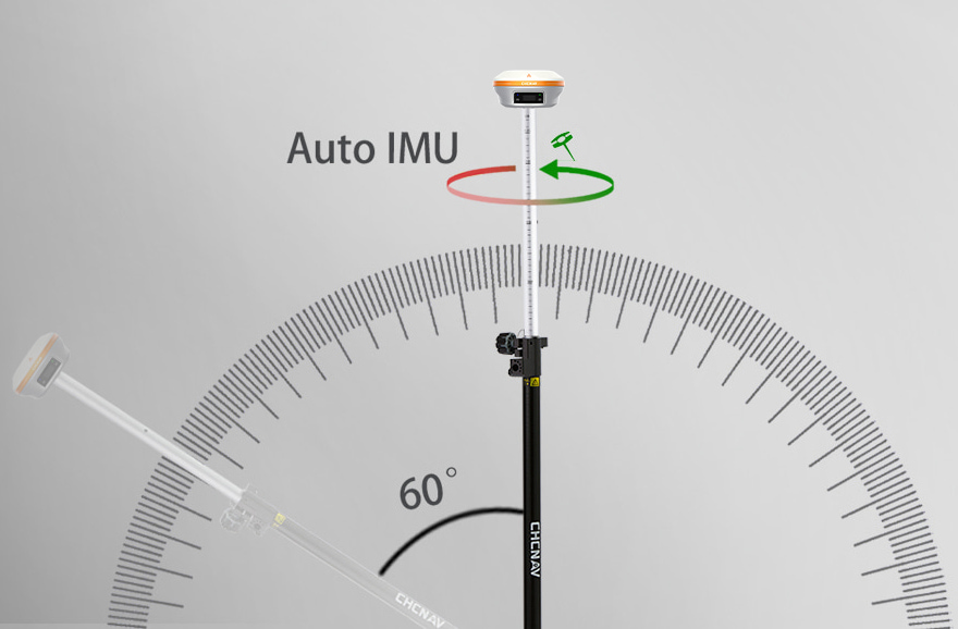 Odbiornik i93 GNSS jest wyposażony w najnowocześniejszą jednostkę IMU firmy CHCNAV, pracującą z częstotliwością 200 Hz i posiadającą funkcję automatycznej inicjalizacji. Korekty dostępne przy wychyleniu tyczki aż do 60 stopni od pionu pozwalają znacząco zwiększyć wydajność pomiarów, eliminując konieczność każdorazowego pionowania tyczki nad punktem.