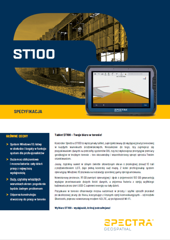 Kontroler Spectra ST100 to wytrzymały tablet, zaprojektowany do wydajnej pracy terenowej w każdych warunkach środowiskowych. Niezależnie do tego, czy zajmujesz się pozyskiwaniem danych na potrzeby systemów GIS, czy też wykonujesz precyzyjne pomiary geodezyjne w trudnym terenie – ten niezawodny i wszechstronny sprzęt sprosta Twoim oczekiwaniom.