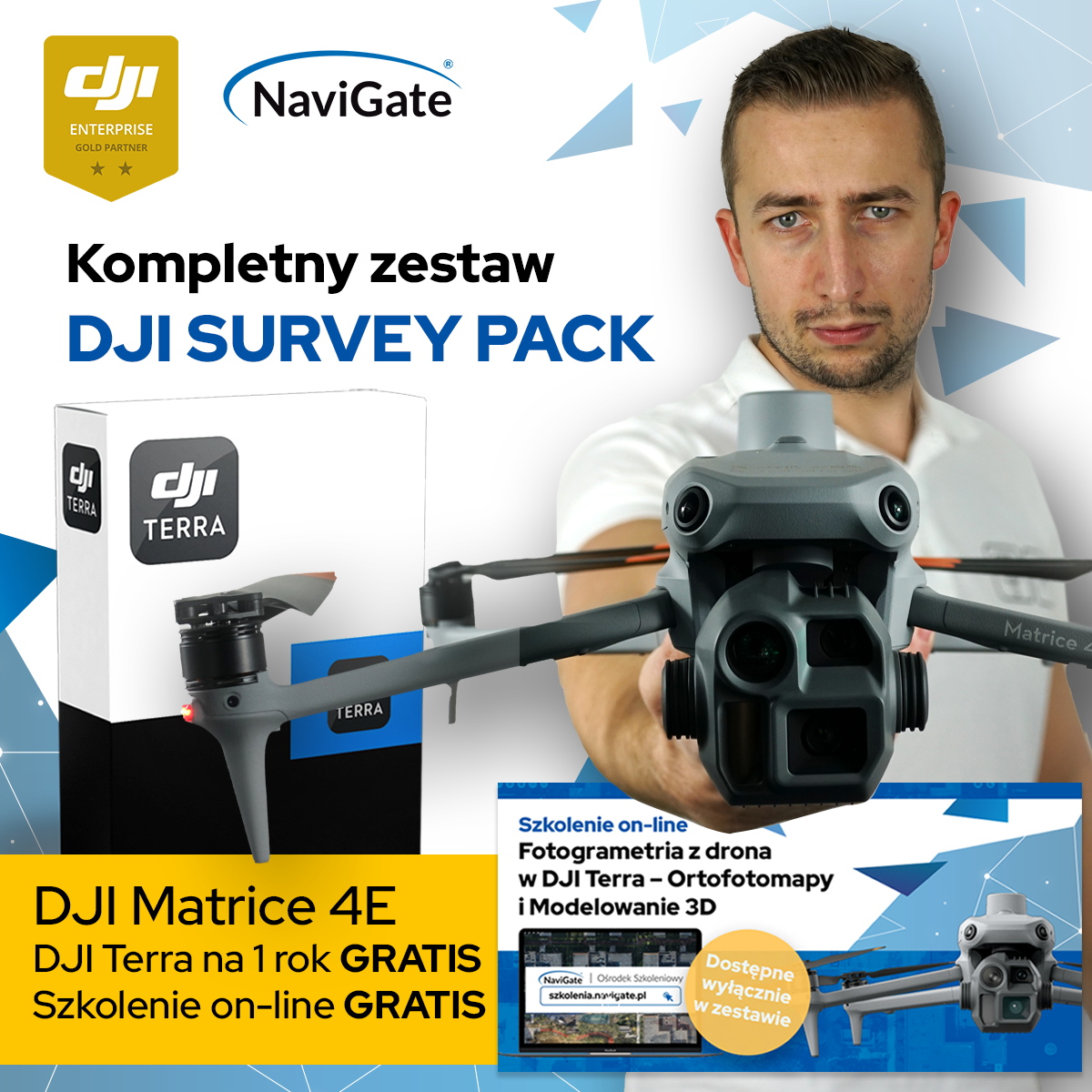 NaviGate, jako Złoty Partner DJI Enterprise i firma specjalizująca się w kompleksowych rozwiązaniach, przedstawia unikalną na rynku ofertę: zestaw zawierający drona DJI M4E, roczną licencę DJI Terra oraz GRATIS dedykowane szkolenie on-line o wartości 2460,00 zł brutto. Zestaw DJI Survey Pack zawiera kompleksowy kurs, który pozwoli w pełni wykorzystać potencjał zakupionego sprzętu.